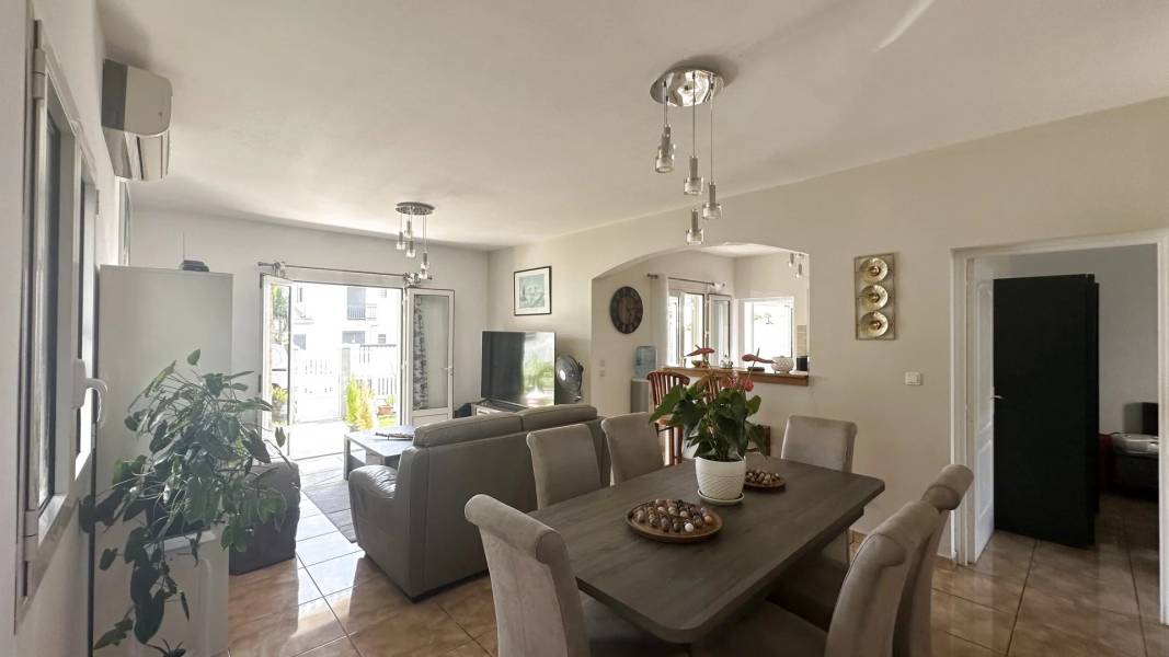 Au rez-de-jardin, un grand séjour climatisé se connecte harmonieusement à la cuisine principale, à la salle à manger et à un coin salon cosy avec vue sur le jardin, idéal pour les moments en famille ou entre amis.