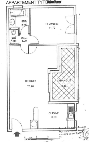 L'appartement dispose d'une cuisine équipée ouverte sur un séjour climatisé de 24 m2, une chambre climatisée, un salle d'eau et wc séparé.